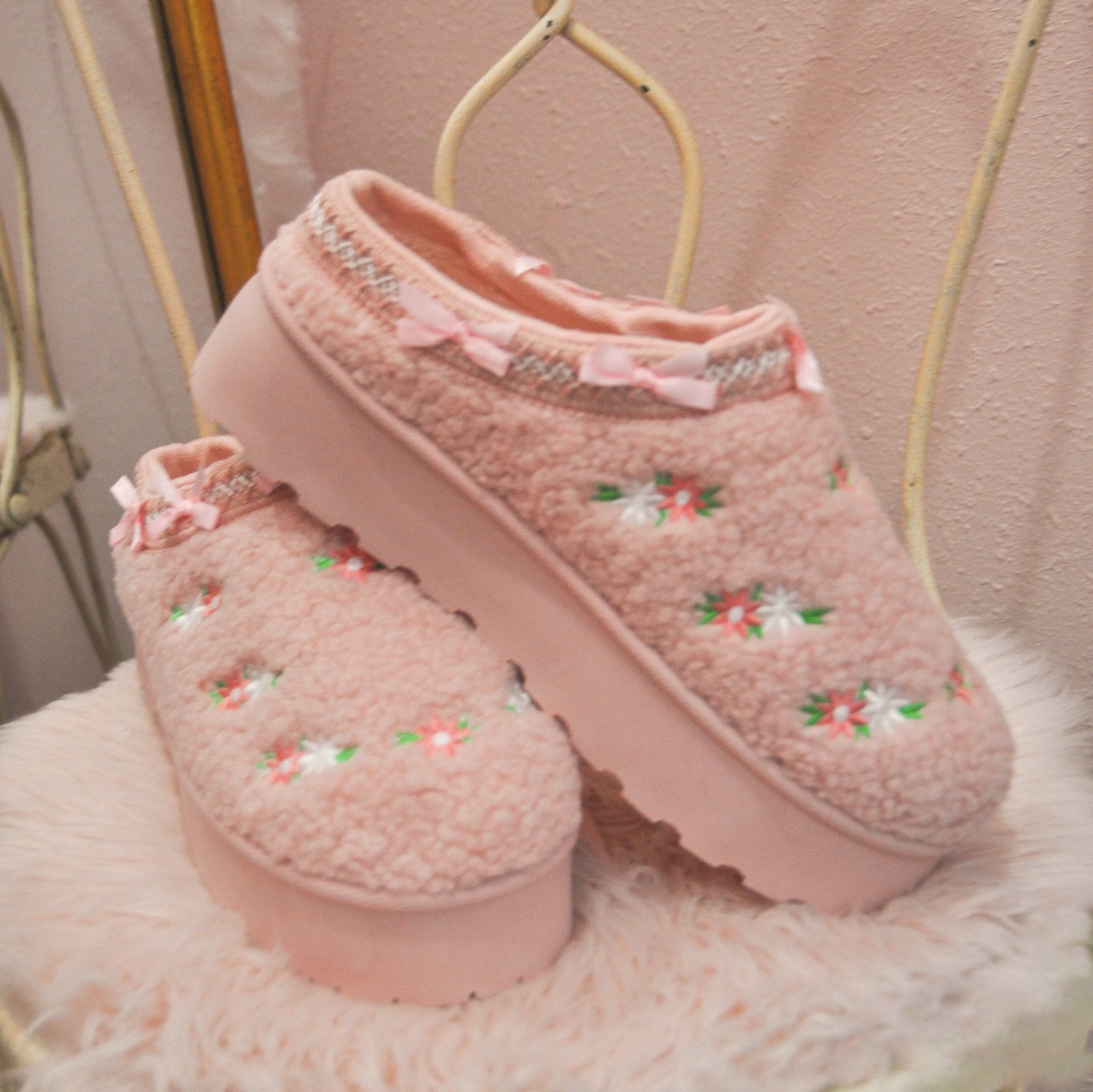 Step into comfort with our Blush Bloom LUXE Slippers—where cozy meets cute! These plush pink sherpa slippers feature adorable bows and delicate embroidered flowers that bring a touch of whimsy to your everyday lounging.