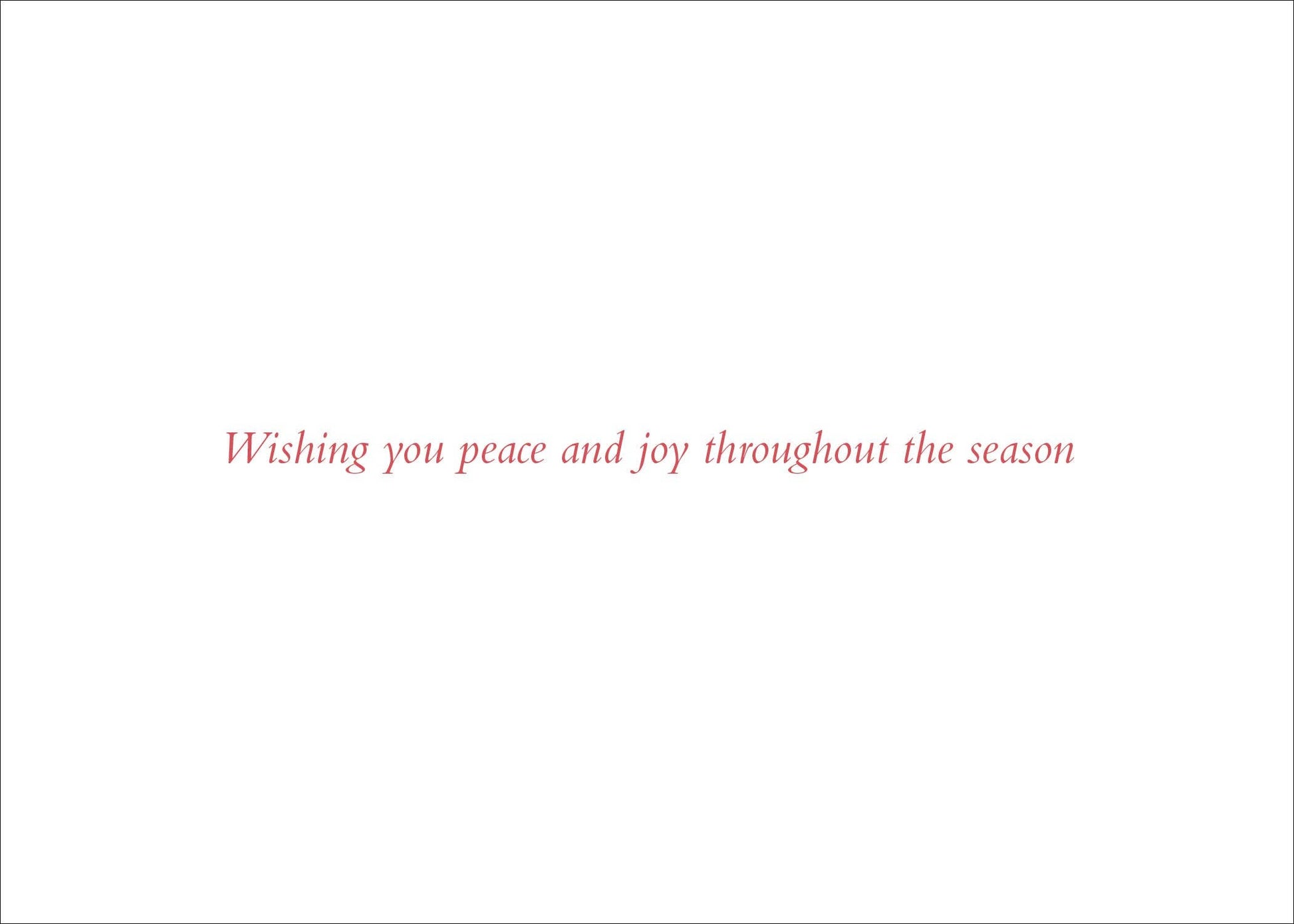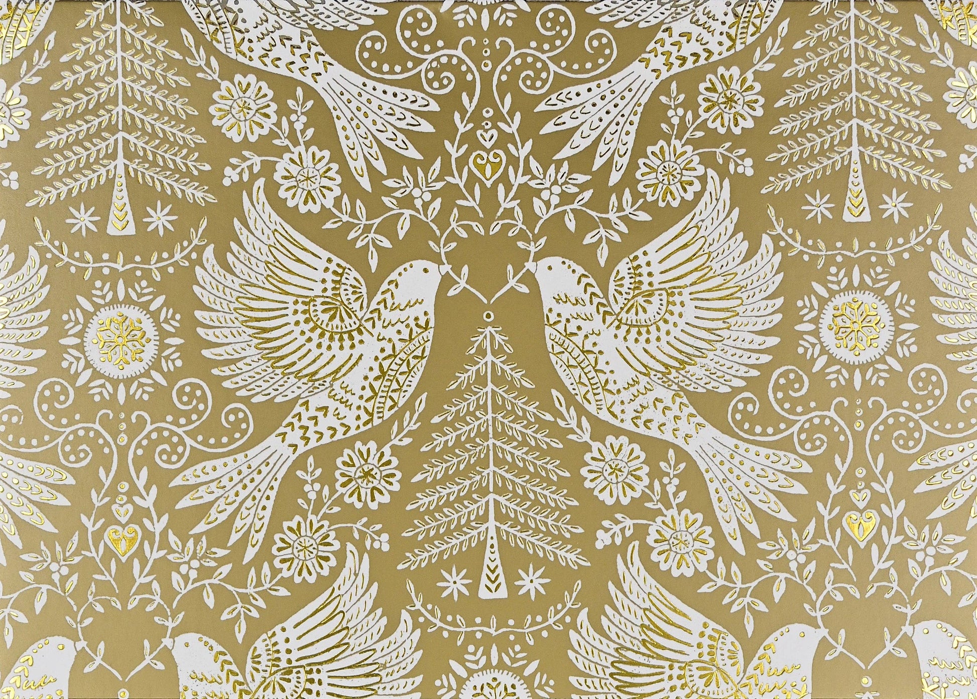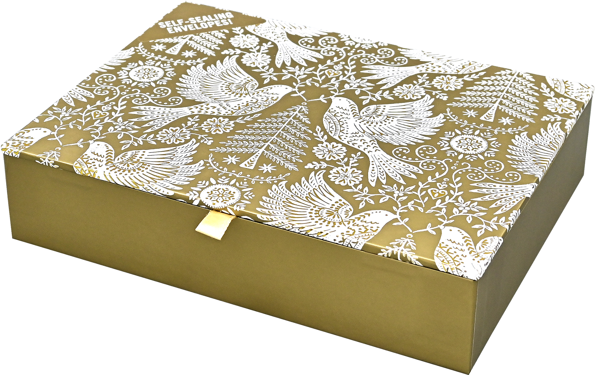 Radiant folk art-style greeting cards feature a repeating design that includes doves, hearts, and Christmas trees. • Premium card set includes 20 cards, 21 envelopes, and a matching keepsake box. • The cards are larger than usual, providing ample space for personal messages.